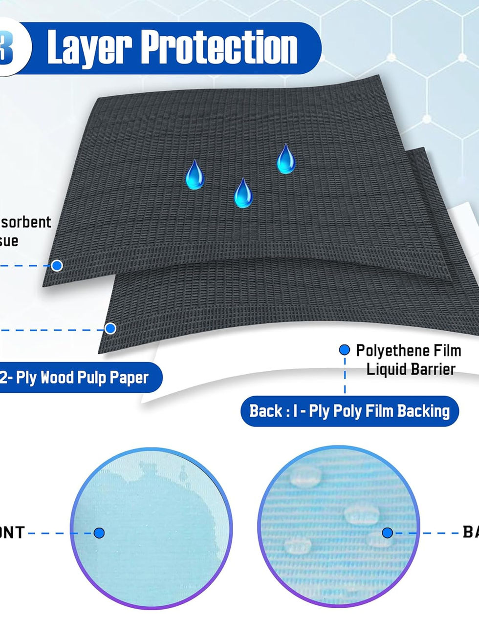 - Triple Layer Protection: Composed of 2-ply tissues and 1-ply film backing. 2-ply tissues will soak up liquids and spills, the 1-ply film can provide optimal liquid barrier